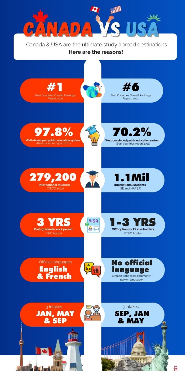 Taking a decision at this point may seem like you are a little mixed up. But you have got the freedom to choose the right destination to study. We’re going to unfold some amazing facts about two popular destinations, Canada and the USA, so keep reading!